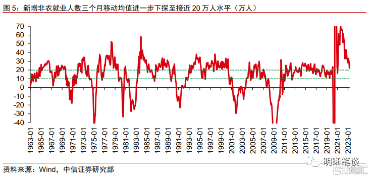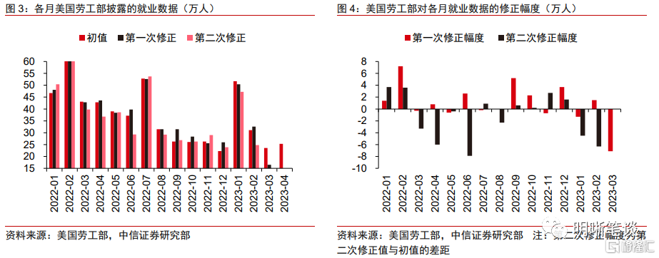 虽然这份非农报告显示美国就业市场超预期强劲,但是需要注意由于前两个月数据下修,非农新增人数三个月移动均值继续下降,进一步接近20万人,本月数据在未来两个月存在向下修正的风险。回顾过往的非农数据来看,近期下修数据的频率与幅度明显上升,1月下修4.5万人左右,2月下修6.3万人,3月从增23.6万人大幅下修至增16.5万人(下修7.1万人),较少见的第一次下修幅度较高,因而当前4月25.3万人面临在未来两个月较大幅下修的风险。同时,由于前两个月下修,新增非农就业人数三个月移动均值(较准确的就业市场是否疲软的指标)实际上在4月是进一步下行至22.2万人,劳动力市场走弱趋势未改。若4月数据修正后再一次低于20万人,则三个月平均新增非农人数将进一步临近20万人,则意味着失业率走出低位震荡期并开始上升期(以高于局部最低点0.3%以上为标志)的时点将临近(该时点往往在三个月平均新增非农人数突破20万人时点附近)。