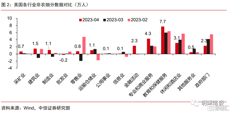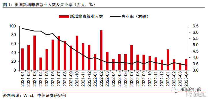 4月美国劳动力市场强劲增长,新增非农就业人口高于预期,失业率下降至历史最低位。美国4月季调后非农就业人口增加25.3万人,高于预期的18.5万人,较上月16.5万人进一步上升。失业率录得3.4%,低于预期3.6%,回落至历史最低位。细分来看,4月美国非农就业人数的增长主要由教育和保健服务、专业和商业服务、休闲和酒店业的增长带动。批发业、采矿业、零售业、公用事业、信息业和其它服务业的新增就业人数均小于1万人。4月平均时薪环比增0.5%,预期增0.3%,前值增0.3%。