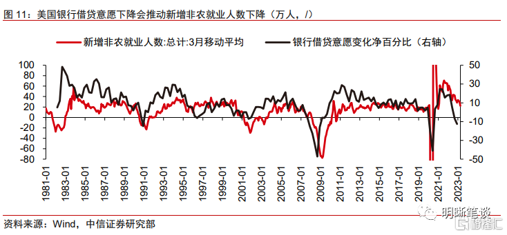 由于未来劳动力市场存在快速走弱的可能性,因而存在美联储年内降息的概率。展望全年,劳动力市场降温预计将一定程度在下半年推动通胀最具粘性的核心服务通胀放缓,届时美联储紧缩压力将有所缓解。因而,若银行业承压,信贷较快紧缩,推动劳动力市场趋弱,这或将加速把美国经济推向衰退,因而今年存在一定降息的可能性。