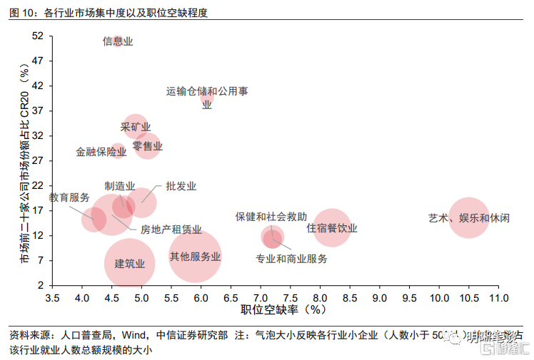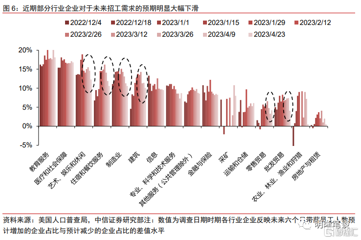 未来美国信贷紧缩加剧或导致美国就业市场更快降温。市场对于存款担忧加剧,叠加短期金融资产高利率的吸引,货币市场基金流入仍在增加,美国银行存款流失预计将继续,这将导致银行不得不增加短期借款,进而推升银行负债端成本以及银行经营压力,抑制银行借贷意愿。此外,市场信心在不断动荡的银行业中继续下降,区域性银行面临较高的抛售风险,KBW纳斯达克区域性银行股指数在3月暴跌后几乎没有恢复,并且在五月以来继续下跌,一些区域性银行例如西太平洋合众银行、阿莱恩斯西部银行等5月以来遭遇抛售,恐慌情绪仍在蔓延。同时,高企的贷款利率也将抑制企业的借款需求,供需两端将共同抑制银行信贷增速。M2以及信贷同比增速已大幅下降,预计信贷紧缩趋势将持续,因而未来企业经营压力将增加,招聘将放缓,尤其是风险抵抗能力较弱的小企业预计将遭受更严厉的信贷紧缩寒风。人口普查局数据显示小企业就业人数(企业人数小于500人)占总就业人数的46%,建筑业、房地产租赁业、住宿餐饮业、其他服务业中小企业就业人数占比超60%,预计未来员工短缺程度较低、市场集中度较低(小企业占比较高)行业的就业市场或因信贷紧缩而更快地降温。