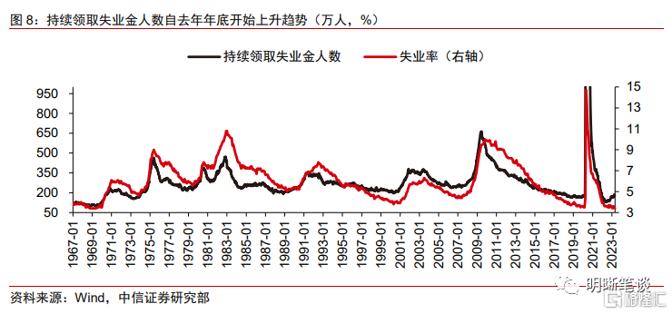 并且一些数据显示出美国就业市场出现了进一步降温的迹象。美国人口普查局企业调查数据显示近期部分行业中企业预期的招工需求大幅下降,包括此前增长一直较为强劲的休闲娱乐行业、住宿餐饮服务行业。并且美国工作时间也在进一步下降,反映出未来劳动力需求将继续下降。此外,反映美国就业市场失业情况的指标——持续领取失业金人数自去年年底开始出现上升趋势,该指标往往领先于失业率变动。