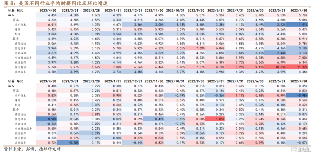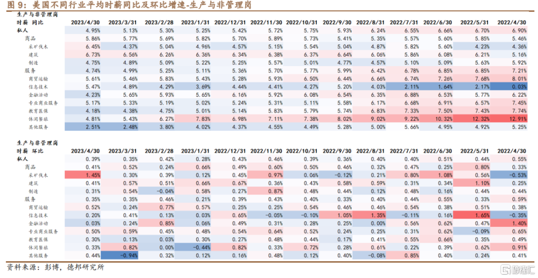 · 时薪增速:更旺盛的劳务需求带来时薪的超预期增长。从时薪增速、尤其是边际消费倾向更高、与实体通胀更贴近的生产与非管理岗的时薪增速来看,4月最新时薪环比仍有+0.39%,其中边际消费倾向最强的休闲餐旅环比增速仍有+0.33%。Powell在5月FOMC曾提到,2%的通胀大约需要3%的工资增速,而当前无论是+0.39%的环比(对应年率+4.68%)还是+4.95%的同比增速都意味着,美国通胀最顽固的一环(非居住核心服务通胀分项占PCE权重55-60%)的回落仍道阻且长。
