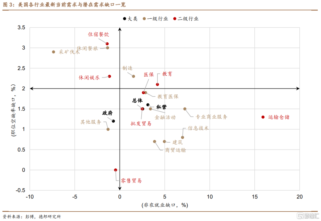 · 就业需求:就业扩散指数提升0.4至57.4,劳务需求边际扩散。单月比较,4月商品生产行业中,建筑(+15k,前值-8k)、制造业(+11k,前值-8k)与耐用品(+10k,前值-5k)行业就业需求显著回暖;服务业中,医保&教育(+77k,前值+60k)、休闲餐旅(+31k,前值+40k)、金融活动(+23k,前值-1k)和专业商业服务(+43k,前值+23k)新增就业靠前,华尔街与硅谷裁员暂缓。与疫情前比,2023年4月美国非农总就业人数较2019年12月绝对多出388.4万人,相对高出2.6%。缺口最大的仍是休闲餐旅行业(行业占比10.6%),绝对、相对缺口分别为-228k、-1.4%。从最新的职位非农就业缺口vs空缺率缺口来看(图3),当前处于第二象限的休闲餐旅仍然处于复苏周期中(职位空缺率缺口>2%、非农就业缺口<0);受益于制造业本土化,制造业呈现出需求过旺(职位空缺>2%、非农就业缺口>0)的局面;而大部分的行业已处于过热周期的末端,呈现出职位空缺率缺口<2%、非农就业缺口>0的局面。