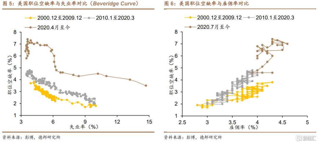 ·供需结构:供给边际走弱,需求延续强劲。4月新增非劳动力人口214k,其中人口自然增长、退出劳动力市场分别贡献171k、43k,对应劳动参与率持平62.6%。4月失业人口减少182k,其中退出劳动力市场、被雇佣分别贡献43k、139k,对应失业率下调0.1%至3.4%,就业率持平60.4%。若考虑表征潜在劳务需求的职位空缺率(3月超预期下跌至9590k),最新的劳务总需求(4月就业+3月职位空缺)为17062万人,劳务总供给为16667万人,最新劳务供需缺口由414万收敛至393万人,潜在劳务需求的超预期下滑加速改善美国就业市场供需缺口。从最新的贝弗里奇曲线来看,短线的劳务市场供需继续朝着软着陆剧本进行的——在失业率保持低位的同时,职位空缺率持续回落。