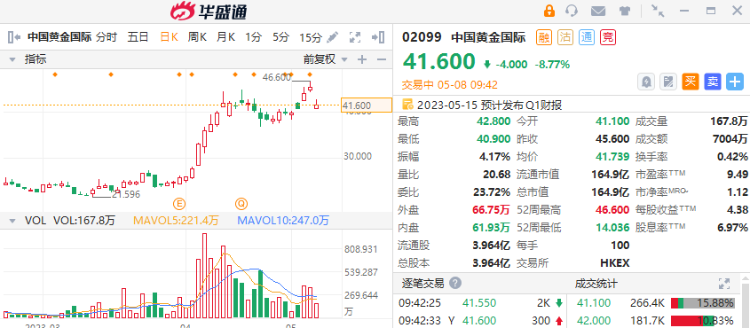 中国黄金国际(02099)开盘跌近10%,截至发稿,跌8.77%,报44.6港元,成交额7004万港元。消息面上,公司昨日发布公告,于2023年3月27日,甲玛矿的果朗沟尾矿库发生尾砂外溢。