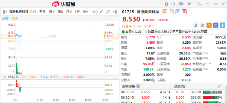 香港航天科技(01725)早盘上涨3.65%,现报8.53港元,成交额2335.150万港元。