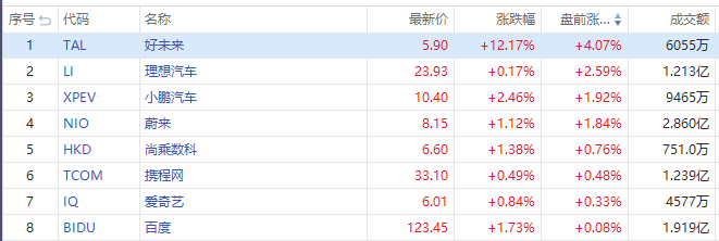 部分中概股盘前走高,好未来涨超4%,理想汽车涨超2%,小鹏汽车、蔚来涨超1%,尚乘数科、携程网、爱奇艺、百度跟涨。