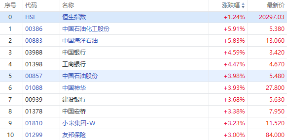 5月8日消息,美股上周五表现理想,非农就业职位数据远超市场预期,加上苹果公司绩后股价造好,支持美股表现,港股上周五则反复靠稳。今日早盘,港股恒指高开高走,午盘涨0.75%,午后恒指涨幅进一步扩大,截至收盘,恒指涨1.24%,报2097.03点。中石化、中海油暴涨近6%,领涨蓝筹。