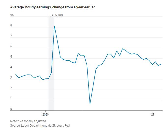 随着美国经济从新冠疫情中复苏,工人工资大幅上涨,并且出现劳动力短缺,助长了通胀。今年年初的工资涨幅仍然很高,尽管已从2022年的峰值回落。
