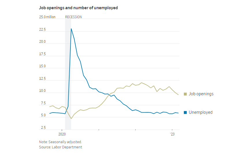 (职位空缺数量(黄线)和失业人数(蓝线)对比)