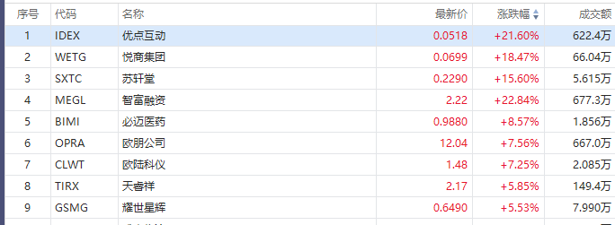 小盘中概股逆势走高,智富融资 $MEGL 涨超22%,优点互动 $IDEX 涨超21%,悦商集团 $WETG 涨超18%,天睿祥 $TIRX 涨超5%。