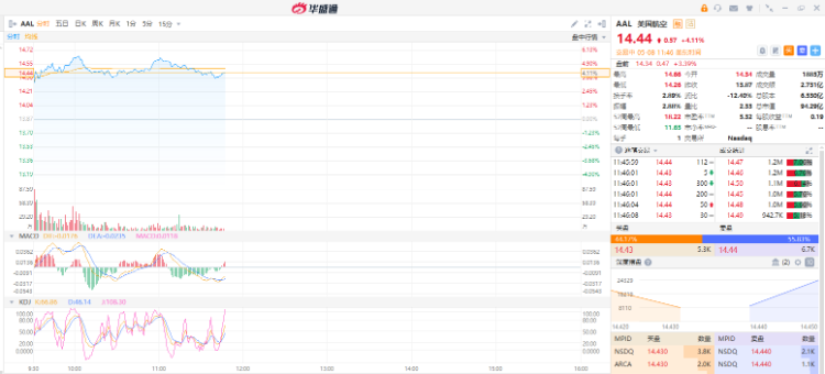 美国航空 $AAL 涨4.11%,报14.44美元,总市值94.23亿美元。