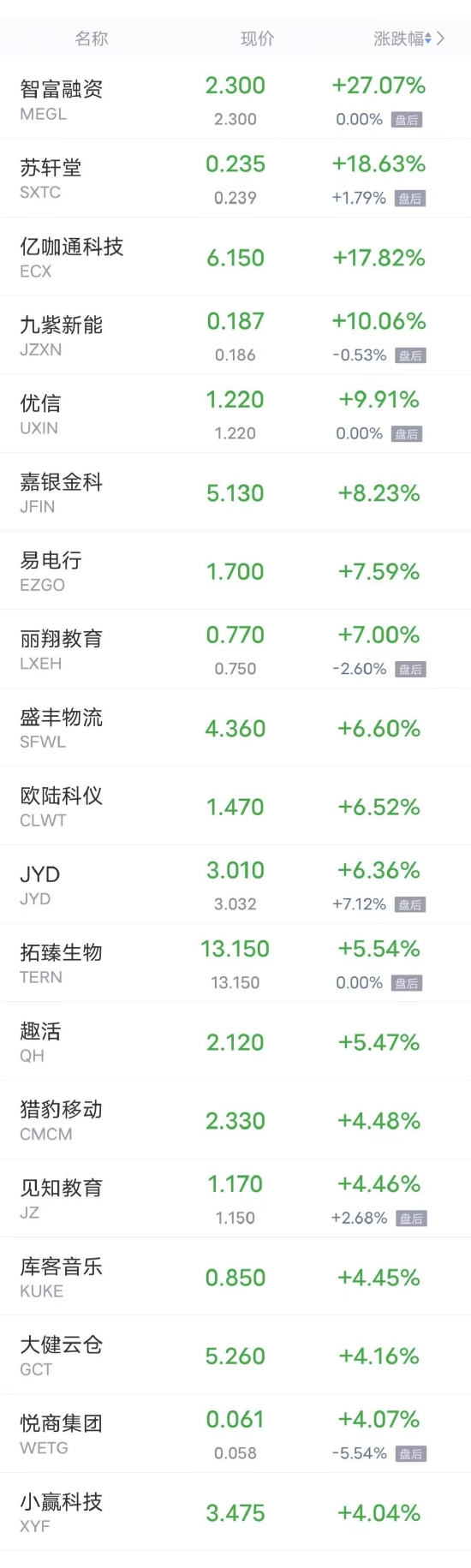 智富融资涨超27%,苏轩堂涨超18%,亿咖通科技涨超17%,九紫新能涨超10%,优信涨超9%,嘉银金科涨超8%,易电行、丽翔教育涨超7%,盛丰物流、欧陆科仪、JYD、中国医药控股有限公司涨超6%,拓臻生物、趣活等涨超5%。