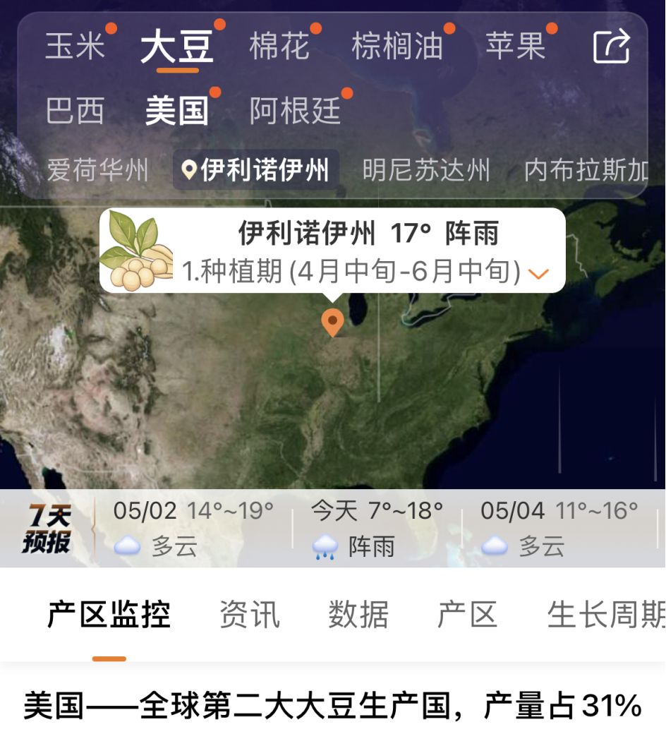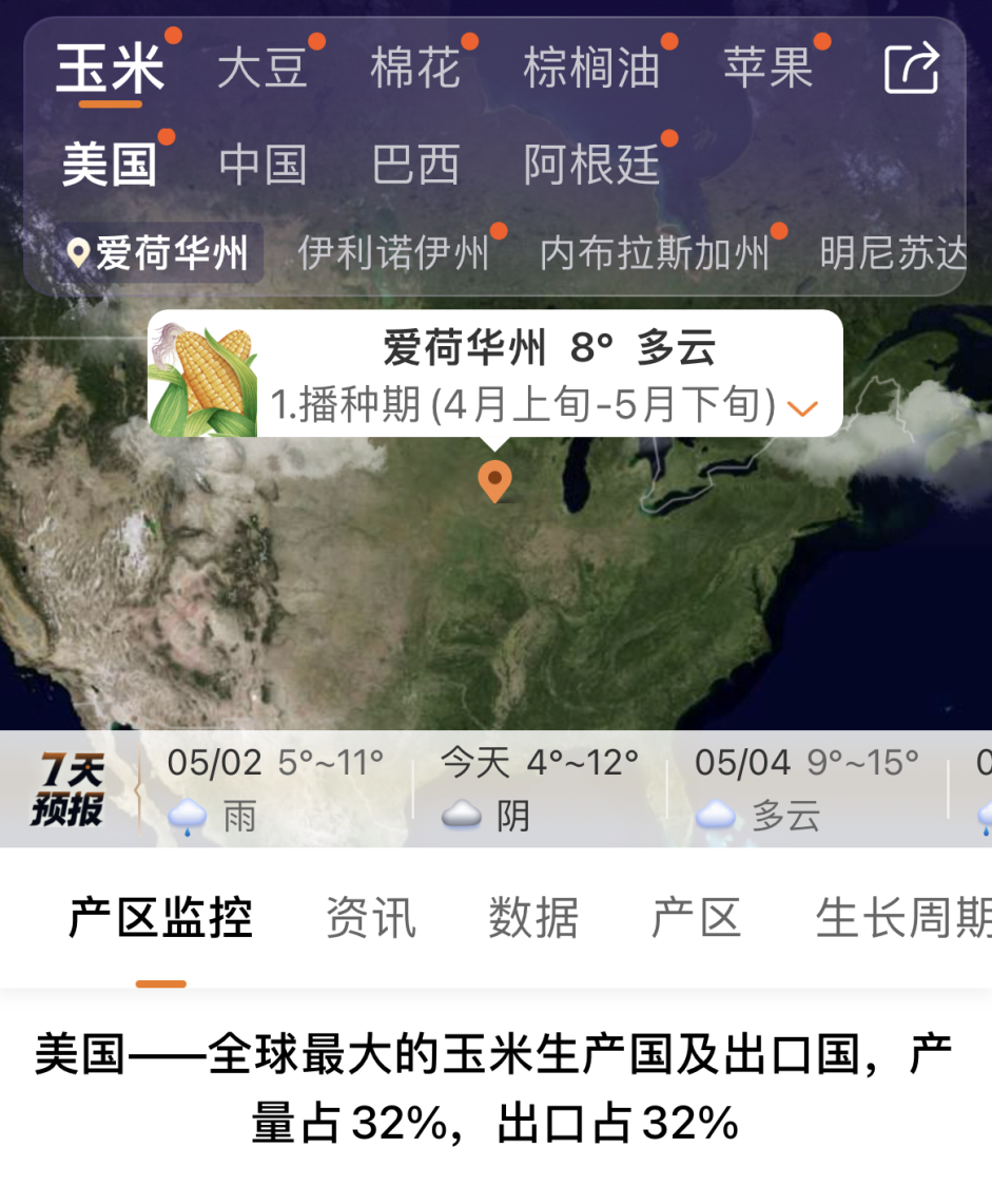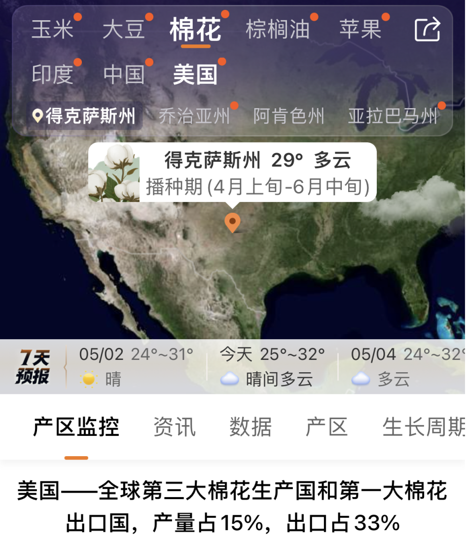 金十期货APP独家推出全球农产品产区功能,每日追踪玉米、大豆、棉花产区的最新动态,异动天气及时预警提醒,助您不错过重要消息。(更新金十期货APP即可体验)
