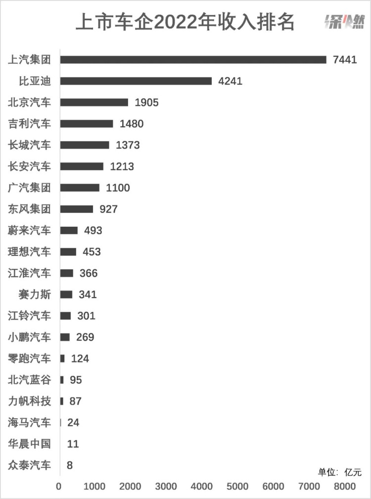 从2022年收入来看,上汽稳坐第一,以7441亿元的总营收遥遥领先;比亚迪以4241亿元排第二;吉利和长城分列第四第五。其中,营收过千亿的车企数量为7家。