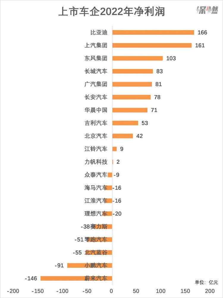 有接近一半的车企(9家),在2022年是亏损的。蔚来、小鹏、理想、零跑这四家上市的新势力,无一例外处于亏损状态,其中蔚来以146亿元的净亏损排第一,小鹏以91亿元排第二。