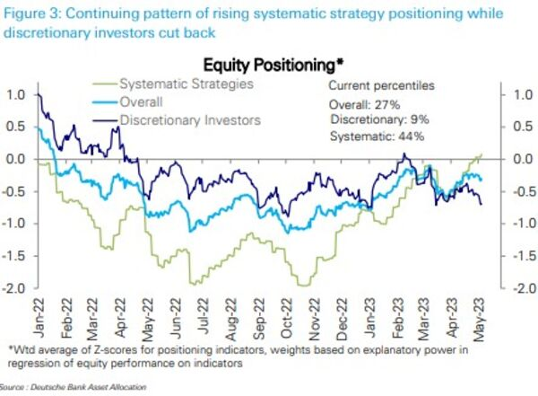 由于价格波动温和、股市反弹,那些根据动量和波动信号配置资产的量化投资者被迫大举买入。德意志银行编制的数据显示,自2021年12月以来,它们的股票敞口首次超过中性水平。