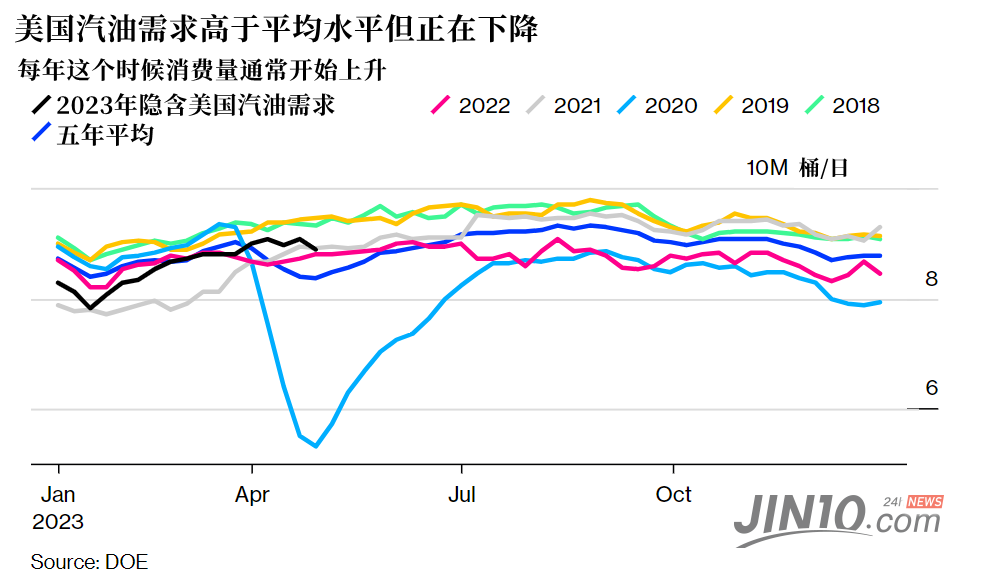 在最新的每周报告中,美国的汽油隐含需求每天暴跌近90万桶,为今年最大降幅,而即将到来的驾驶季节看起来也并非那么令人鼓舞。根据政府预测,6月至8月期间,美国汽油消费量将达到每天909万桶,同比略有上升,但仍比疫情前的水平下降6%以上。