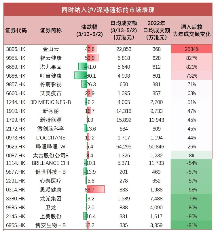 回溯最近一次港股通调整后市场数据,截至5月2日,同时调入沪港通和深港通的33只股票,平均成交额上升37%。股价方面智云健康、金山云表现领先,区间涨幅分别为53.9%,43.6%。思派健康、哔哩哔哩-W、艾美疫苗等均录得上涨。