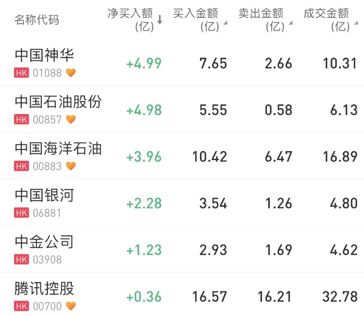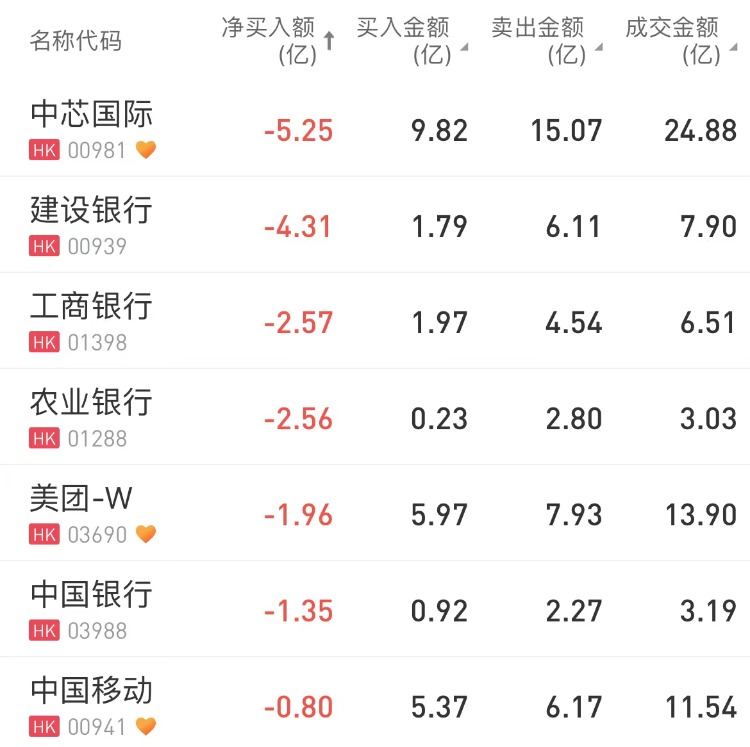 南向资金净买入9.40亿港元。中国神华、中国石油股份、中国海洋石油分别获净买入4.99亿港元、4.98亿港元、3.96亿港元。中芯国际净卖出额居首,金额为5.25亿港元。