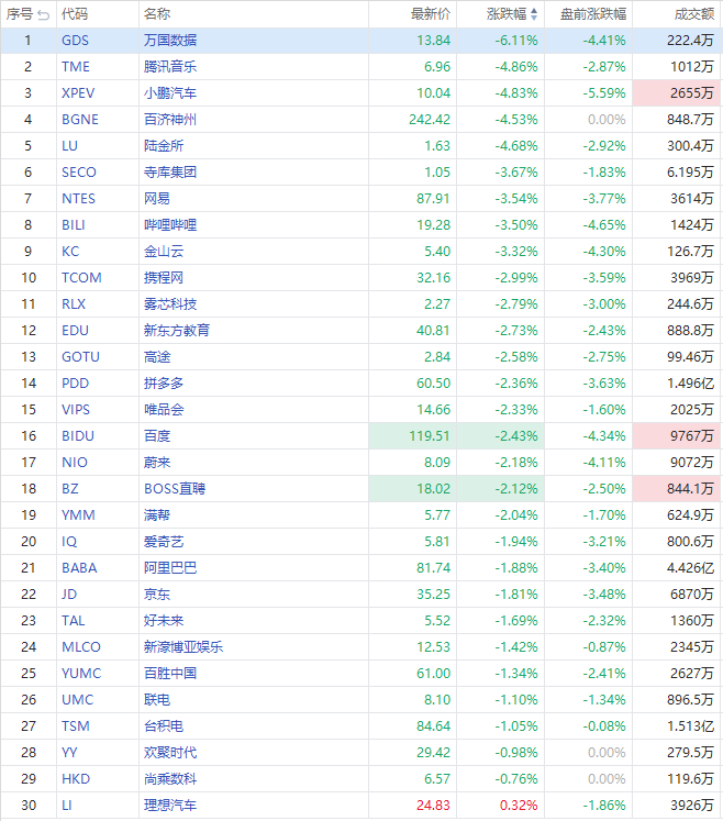 华盛资讯5月9日消息,热门中概股普跌,3倍做空富时中国50指数ETF $YANG 涨超5%,万国数据跌超6%,陆金所、腾讯音乐、百济神州跌超4%,哔哩哔哩、网易、寺库集团、金山云跌超3%,百度跌超2%,爱奇艺、京东跌超1%。