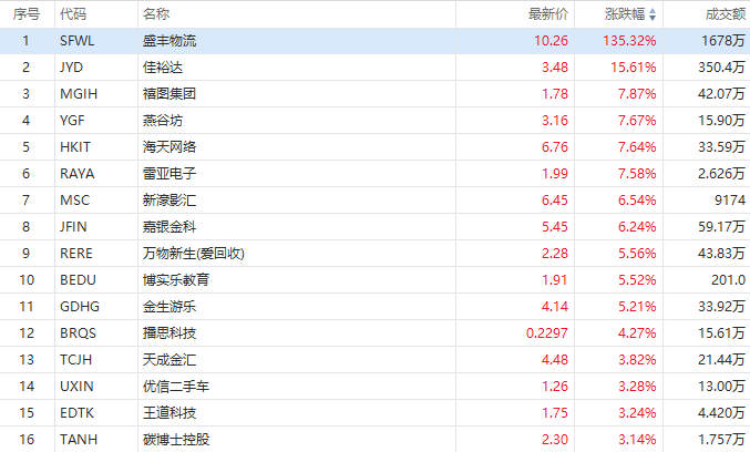 小盘中概股逆势走高,次新股盛丰物流 $SFWL 涨超135%,盘中停牌,佳裕达 $JYD 涨超15%,海天网络 $HKIT 涨超7%,新濠国际 $MSC 涨超6%。
