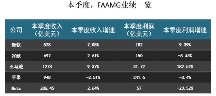 对于本季度FAAMG业绩来看,巨头们的B端业务环比明显改善,云业务增速仍然占优(AWS/AZURE/谷歌云)。在C端业务环比有所改善,消费电子库存低点。像亚马逊、Shopify这样电商公司收益于消费者支出保持稳定。谷歌、Meta在广告整体仍承压,但明显优于预期。本季度微软和Meta业绩成为最大惊喜。