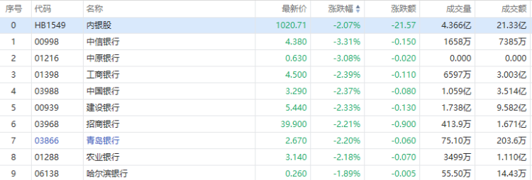 华盛资讯5月10日讯,港股早盘小幅震荡走弱,内银股集体回调,中信银行跌超3%,中国银行、建设银行、招商银行、农业银行均跌超2%。