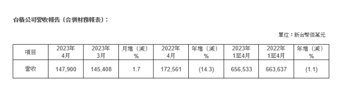 台积电4月实现销售额1479亿元台币,环比增长1.7%,同比下降14.3%。