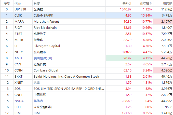 区块链概念多数走高,CLEANSPARK $CLSK 涨超15%,Riot Blockchain $RIOT 、Marathon Patent $MARA 、比特数字 $BTBT 涨超10%,微策略 $MSTR 涨超6%,嘉楠科技 $CAN 涨超4%,美国超微公司 $AMD 涨超4%,英伟达 $NVDA 涨超1%。
