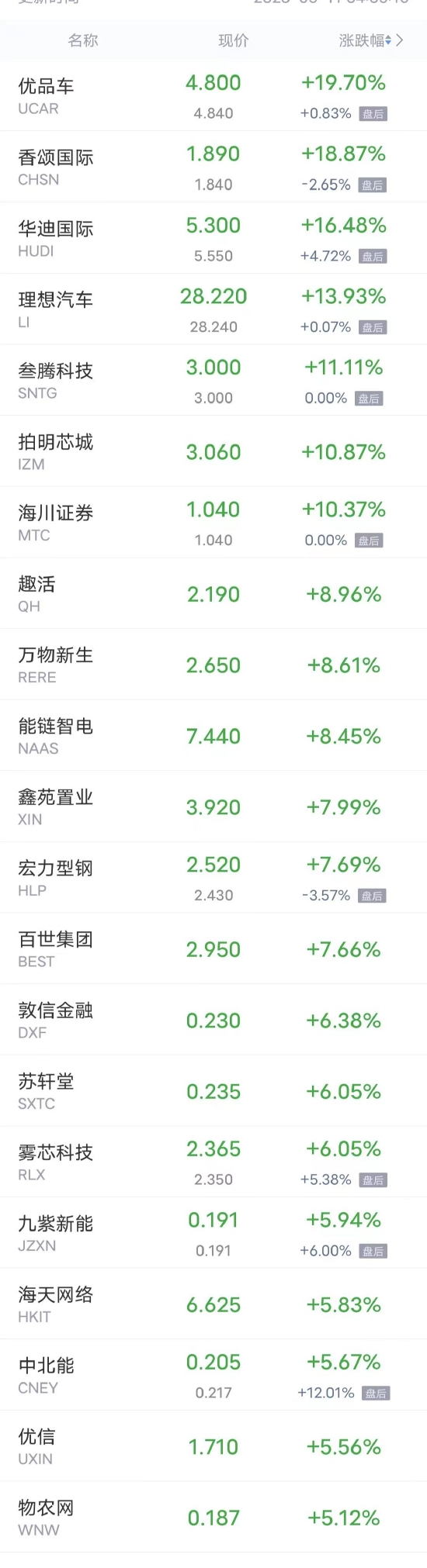 优品车涨超19%,香颂国际涨超18%,华迪国际涨超16%,理想汽车涨超13%,叁腾科技涨超11%,海川证券涨超10%,趣活,万物新生,能链智电涨超8%,鑫苑置业,宏力型钢,百世集团涨超7%,敦信金融,苏轩堂,雾芯科技涨超6%,九紫新能,海天网络,中北能,优信,物农网,玉柴国际等涨超5%。