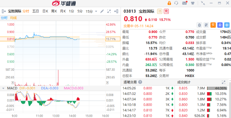 5月11日讯,港股体育用品股多数走高,截至发稿,宝胜国际上涨15.71%,报0.81港元;滔搏涨近4%,特步涨超1%。