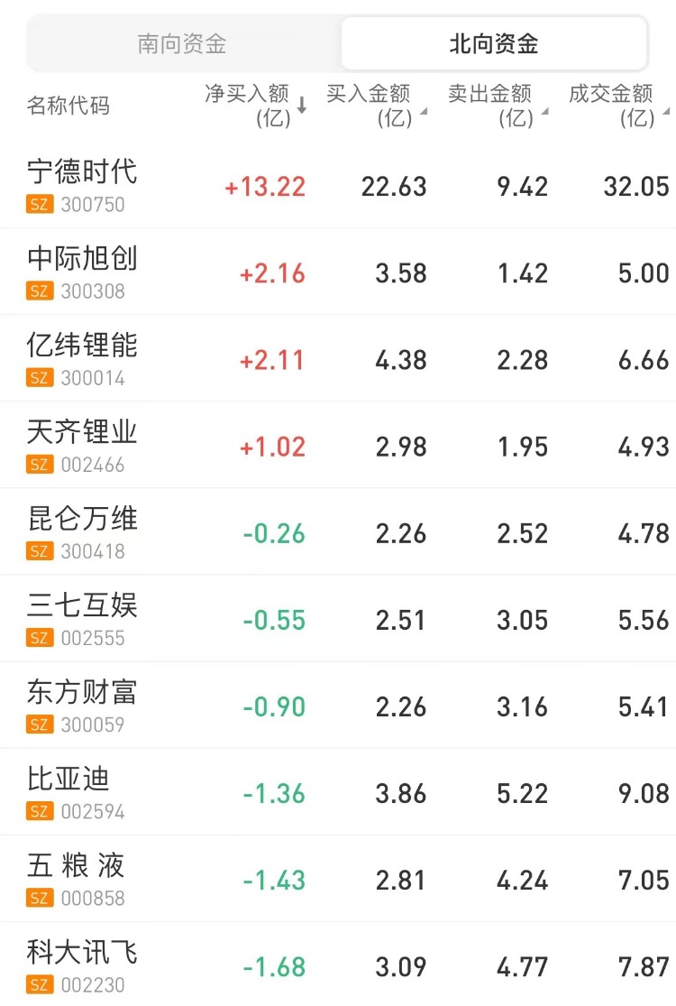 今日宁德时代、中际旭创、亿纬锂能分别获北向资金净买入13.22亿元、2.16亿元、2.11亿元。科大讯飞净卖出额居首,金额为1.68亿元。