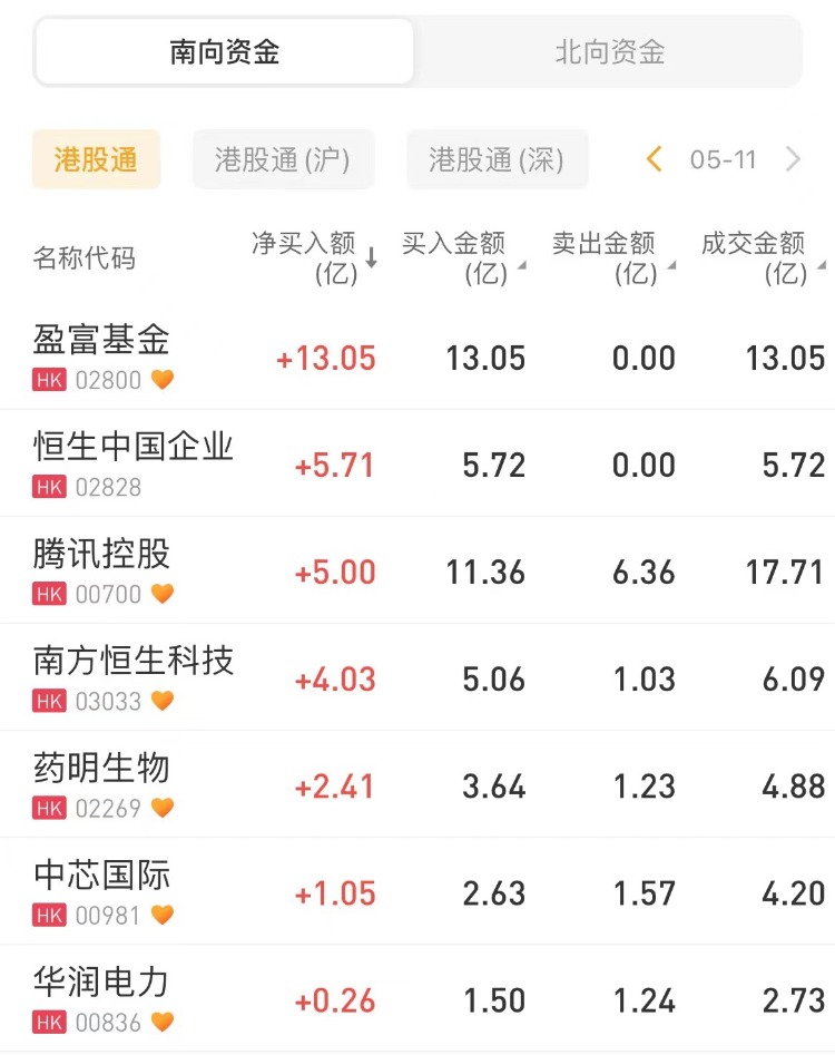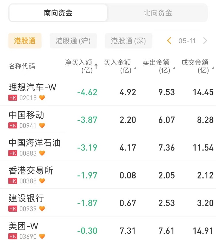 盈富基金、恒生中国企业、腾讯控股分别获净买入13.05亿港元、5.71亿港元、5亿港元;理想汽车-W净卖出额居首,金额为4.62亿港元。