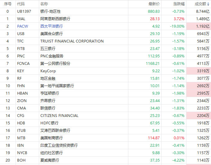 区域银行股集体走低,西太平洋银行 $PACW 盘中一度跌超29%,触发熔断,现跌超19%。阿莱恩斯西部银行 $WAL 涨超3%,美国合众银行 $USB 跌1.19%,第一公民银行 $FCNCA 跌0.6%;五三银行 $FITB 跌超3%,地区金融 $RF 跌超1%,PNC金融服务 $PNC 跟跌。