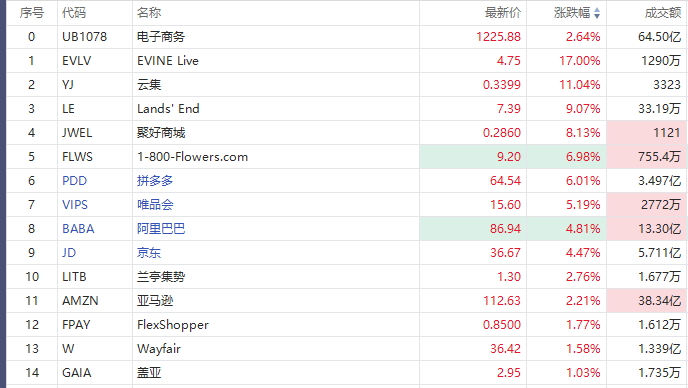 电子商务板块多数走高,EVINE live $EVLV 涨超17%,云集 $YJ 涨超11%,聚好商城 $JWEL 涨超8%,拼多多 $PDD 涨超6%,阿里巴巴 $BABA 、京东 $JD 涨超4%,亚马逊 $AMZN 涨超2%,盖亚 $GAIA 涨超1%。