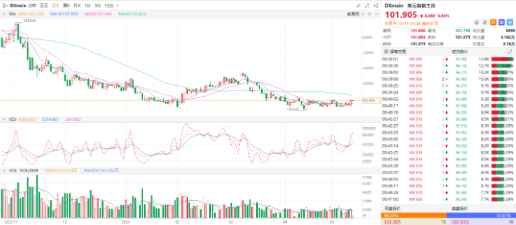 美元指数小幅走高至101.905点,即将达到0.85%的周涨幅。分析师表示,美元本周可能受益于其作为避险投资的地位,因为美国债务上限僵局和对银行风险的担忧让投资者感到不安;而美元的走高很可能是在一段时间的疲软之后出现的反弹。
