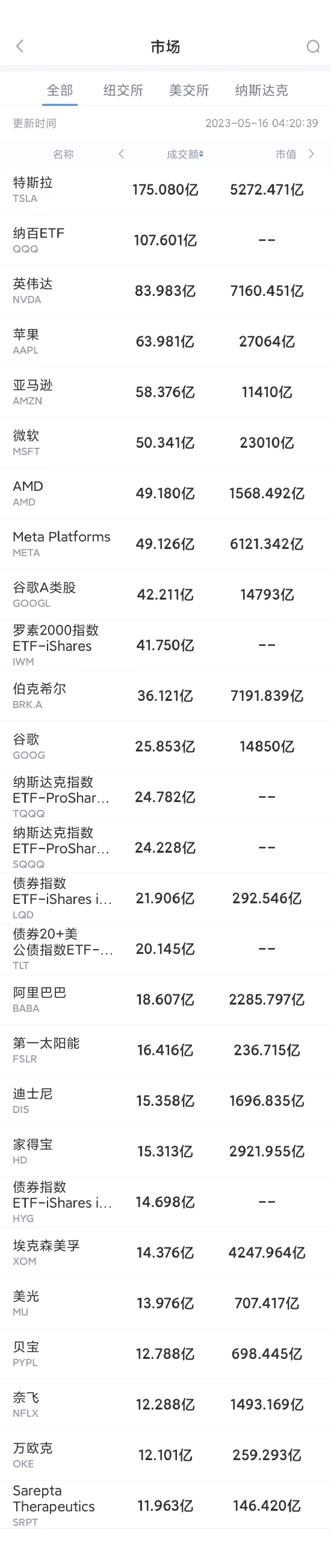以下为美股当日交易最活跃的20只股票(按成交额):