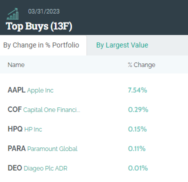 巴菲特旗下伯克希尔哈撒韦公布的13F文件显示,伯克希尔哈撒韦Q1没有持仓区域性银行Bancorp、纽约梅隆银行,也没有持股豪华家具零售商 $RH ,并清仓台积电ADR。建仓做多Capital One等三只股票;增持苹果、西方石油、惠普、派拉蒙、花旗等七只股票;减持雪佛龙和通用汽车等八只股票。