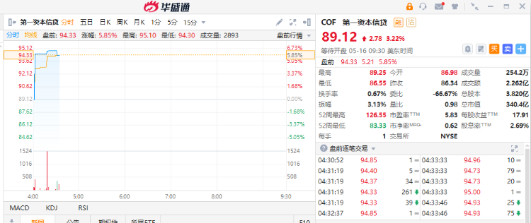 第一资本信贷盘前涨近6%,报94.33美元每股。13F文件显示,巴菲特旗下伯克希尔哈撒韦一季度建仓Capital One 992.2万股,持仓价值为9.54亿美元,为伯克希尔哈撒韦第24大持仓股。