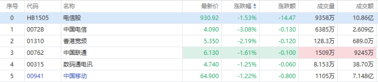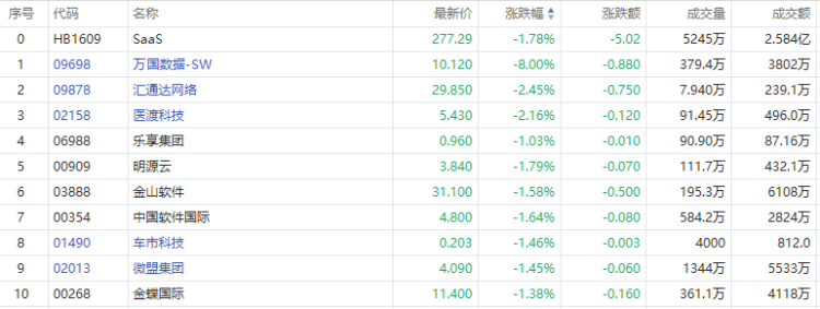5月17日讯,港股SaaS概念股早盘集体下挫,电信股集体走低,截至发稿,万国数据-SW跌8%,中国电信跌超3%,明源云、中国移动、中国联通跌超1%。