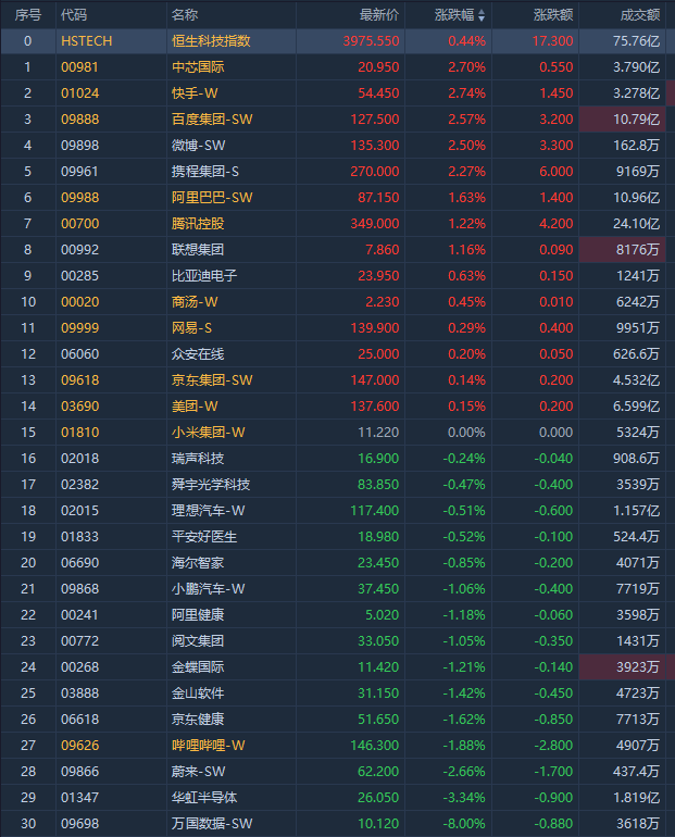 科网股方面,快手-W、百度集团涨超2%,阿里巴巴、腾讯控股涨超1%,网易、京东、美团跟涨。