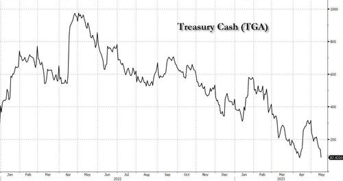除了上述特别措施外,美国财政部还可以动用其TGA账户的现金来偿付债务和维持政府开支以填补窟窿。在之前历次债务上限危机中,TGA账户均发挥了实际支付政府运转开支的作用。而根据美国财政部的数据,截止本周二,美国TGA账户的余额已经锐降至了874亿美元(短短一天内骤降了520亿美元),较1月底的5726亿美元大幅缩水。