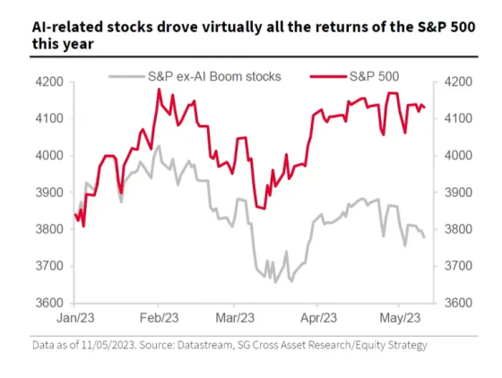 那么在这样一个大环境下,坚挺的科技股,尤其是AIGC领域的龙头,依然有巨大的成长空间。可以看到,美股市场今年以来的整体上行,与几家AI巨头的强势表现具有强相关性。分析师表示,如果没有AI热门股票的上涨,标普500指数今年将下跌2%,而不是上涨8%。