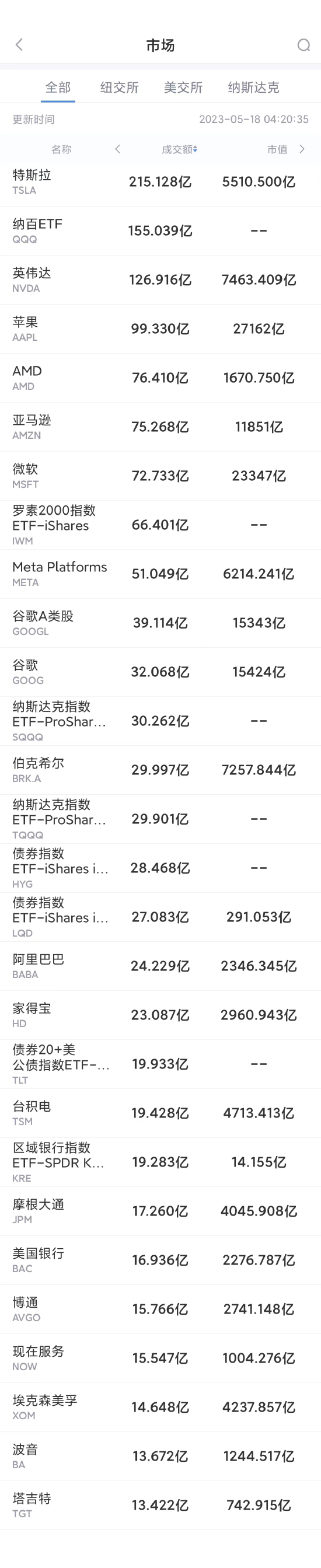 以下为美股当日交易最活跃的20只股票(按成交额):
