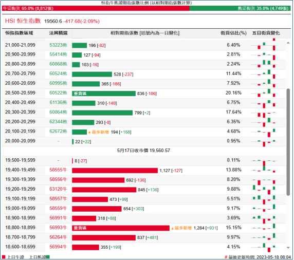 周三港股低开低走,大幅收跌,北水大笔资金净买入。 市场受到美国债务上限协议不确定性和中国内地企业基本面增强的双重影响,市场走势还未明朗。 若看好后市,可关注恒指牛证57274,收回价19088点,杠杆比率约37.9倍;若看空后市,可关注恒指熊证62833,收回价20200点,杠杆比率约23倍。