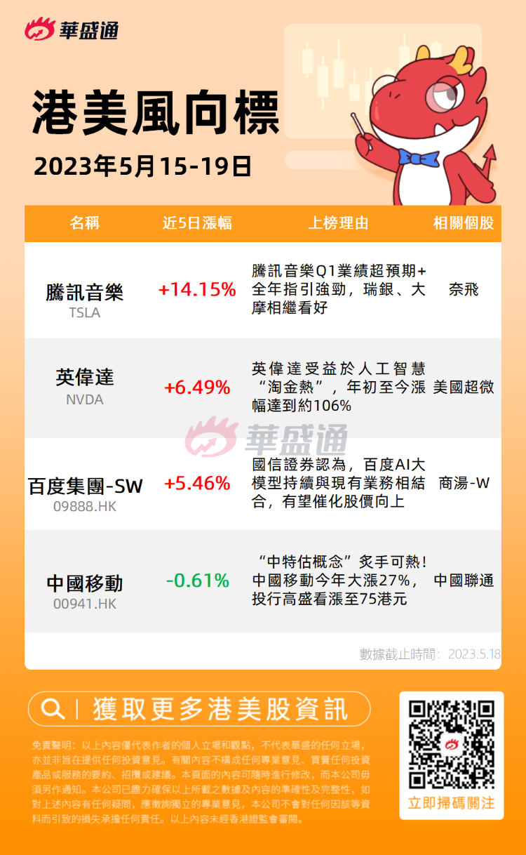 - 大和发布研究报告称,腾讯音乐线上音乐服务收入的运行率不俗,将抵销社交娱乐业务进一步疲软。由于在线音乐利润率的提高,该行将其2023-24年的盈利预期上调12-13%。