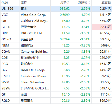 美股黄金板块走低,巴里克黄金、纽曼矿业跌超3%,金田跌超2%。