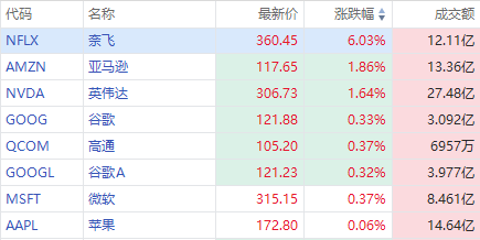 美股明星科技股普涨,奈飞涨超6%,亚马逊、英伟达涨超1%,谷歌、高通、微软、苹果跟涨。消息面上,此前公司高管表示最近推出的含广告订阅套餐达到每月近500万活跃用户,并强调其节目对潜在广告商的广度。