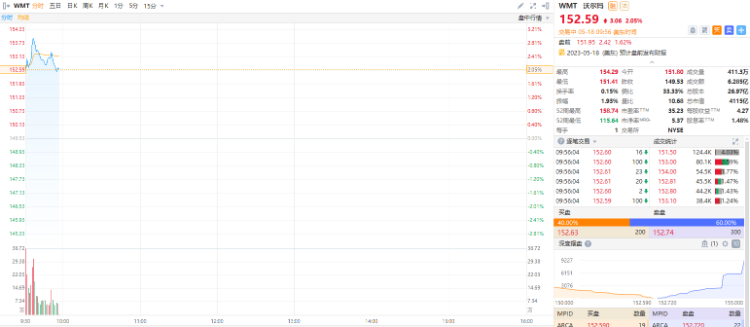 沃尔玛第一季度营收1523亿美元,超预期的1487亿美元;调整后每股盈余1.47,超预期的1.31美元;除去汽油后,全美可比营收增长7.3%,超预期的5.08%。沃尔玛预计第二季度调整后每股盈余1.63-1.68美元,低于预期的1.7美元;全财年调整后每股盈余6.1-6.2美元,其中值超预期6.14美元,此前为5.9-6.05美元;全财年营收增长3.5%,此前为2.5%-3%。